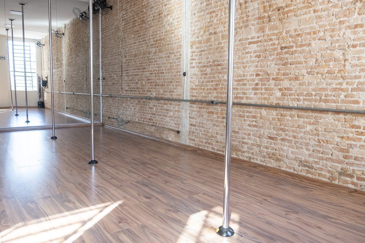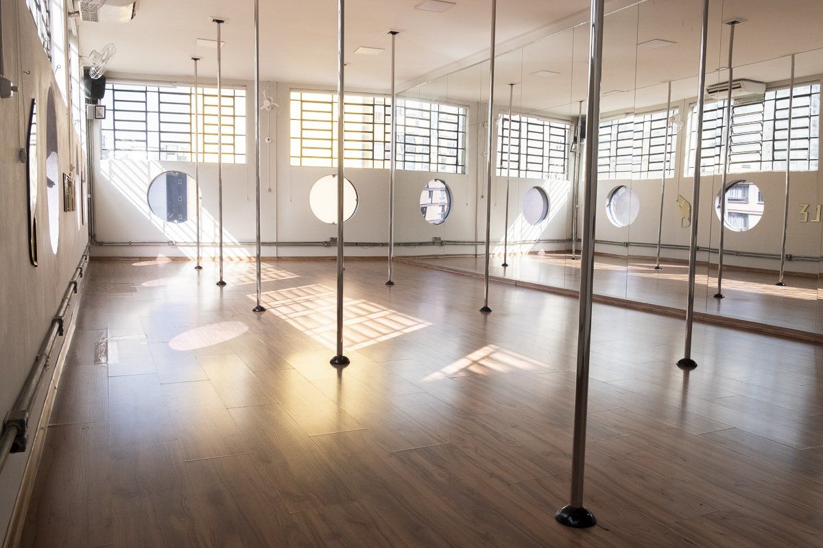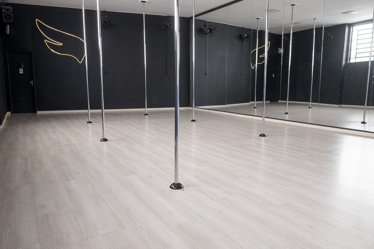 Nós temos 4 salas de pole dance, sendo a maior delas com 10 barras e com um total de 28 barras no studio todo. Todas as barras são fixas e giratórias, possuem 3,75m de altura e mais de 2,5m de distância entre elas, com espelho que acompanha todo o comprimento das barras, proporcionando visualização total dos movimentos realizados. As salas são climatizadas com ar-condicionado e o piso é de madeira flutuante, o que proporciona mais segurança e comodidade para alunos e instrutores. Contamos, também, com dois vestiários com armários, banheiro e chuveiro. Temos WI-FI e uma lojinha onde todos os acessórios necessários para a pratica de Pole Dance podem ser encontrados.